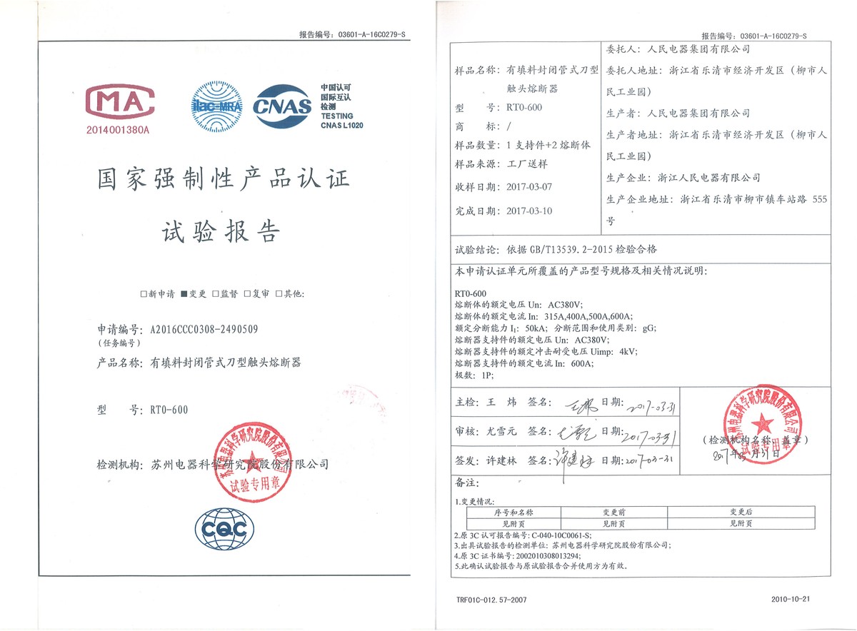 CCC试验报告(201703):RT0-600有填料封闭管式刀型触头熔断器(点击下载)