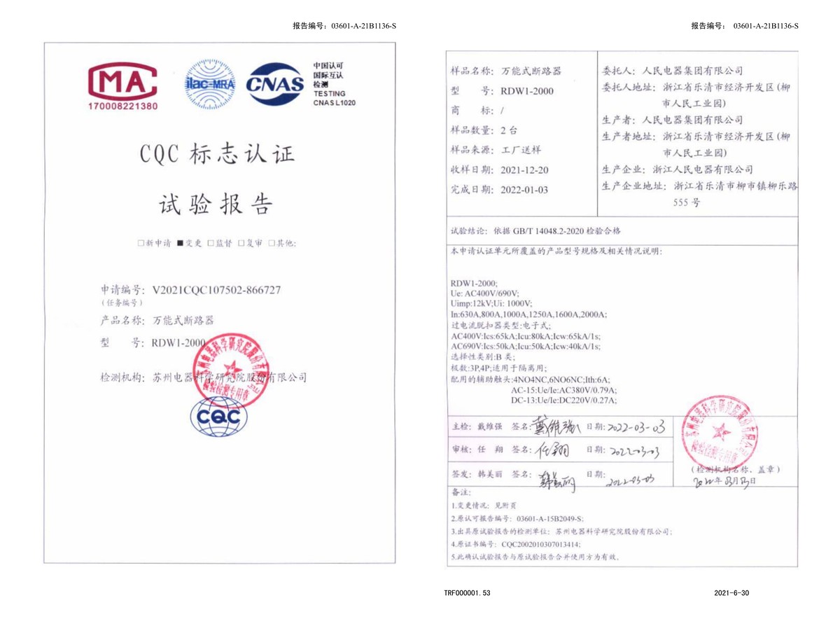 CQC试验报告(202203):RDW1-2000万能式断路器(点击下载)