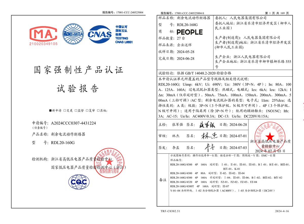 CCC试验报告(202407):RDL20-160G漏电断路器(点击下载)