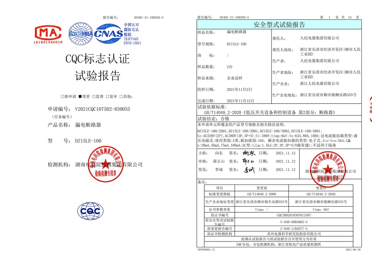 CQC试验报告(202111):DZ15LE-100漏电断路器(点击下载)