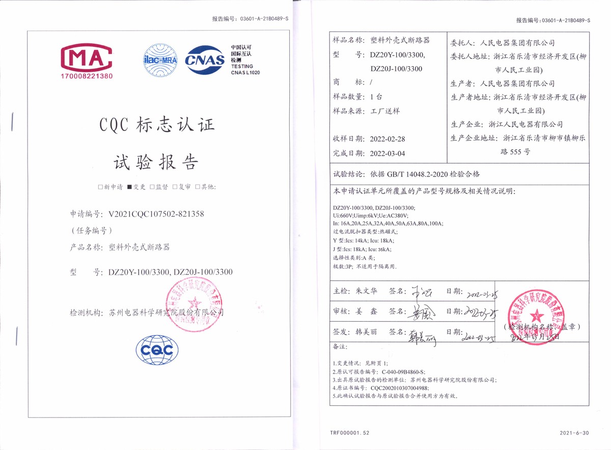 CQC试验报告(202203):DZ20Y-100/3300,DZ20J-100/3300塑料外壳式断路器(点击下载)