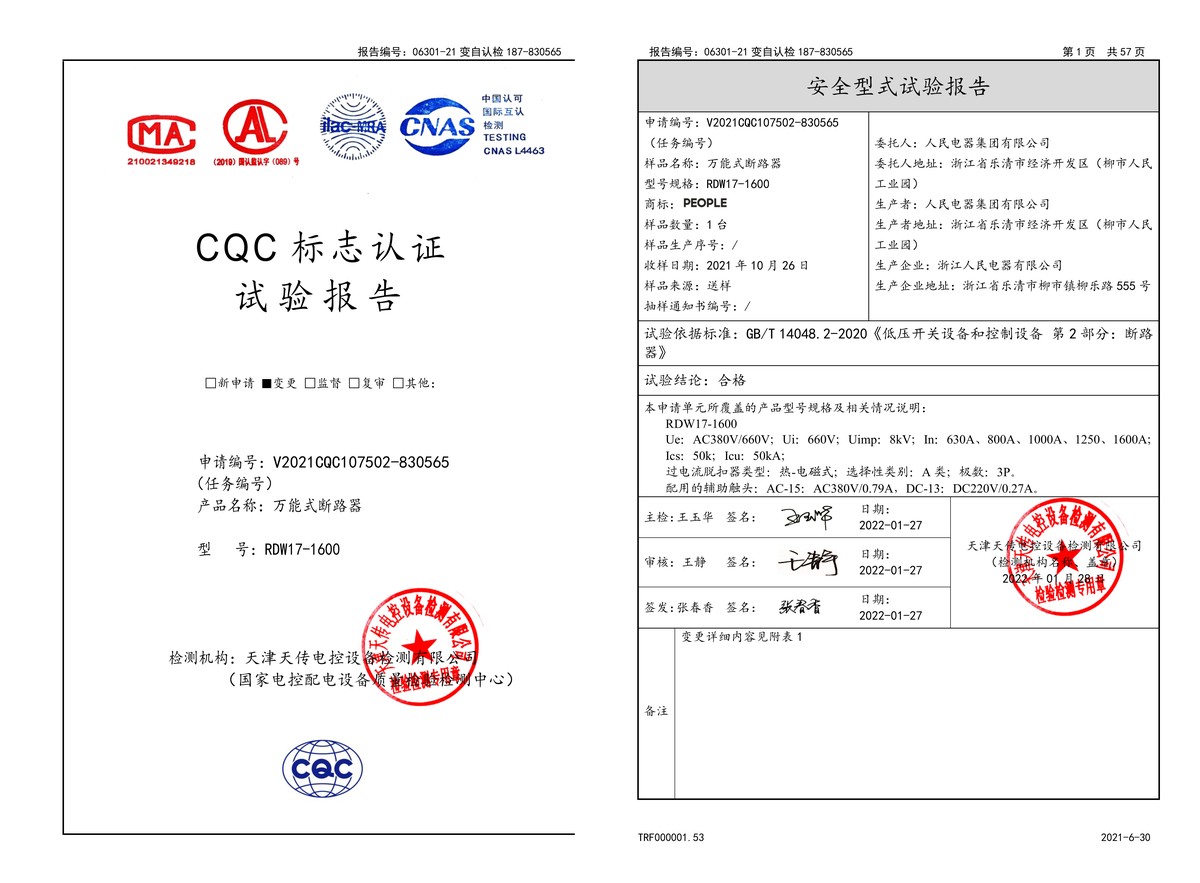 CQC试验报告(202201):RDW17-1600万能式断路器(点击下载)