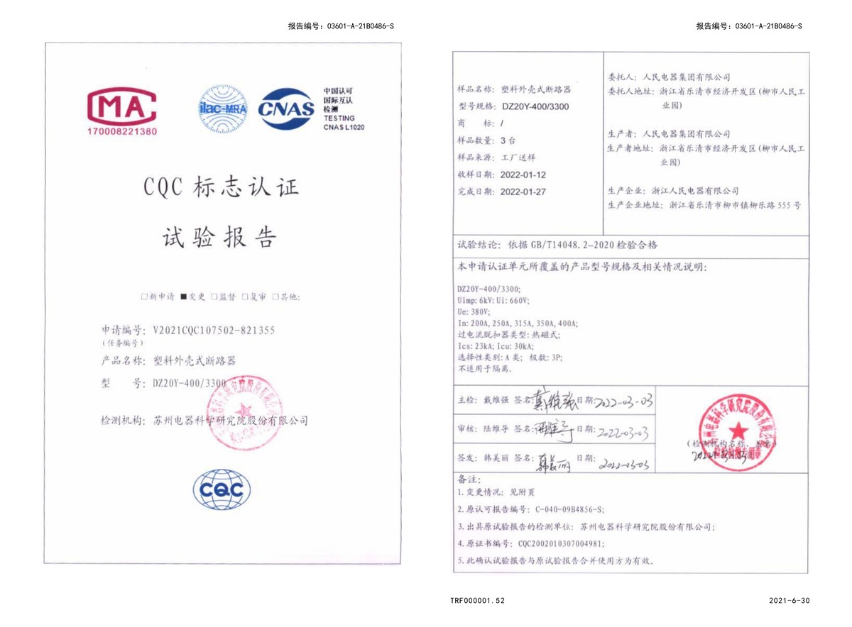 CQC试验报告(202203):DZ20Y-400/3300塑料外壳式断路器(点击下载)