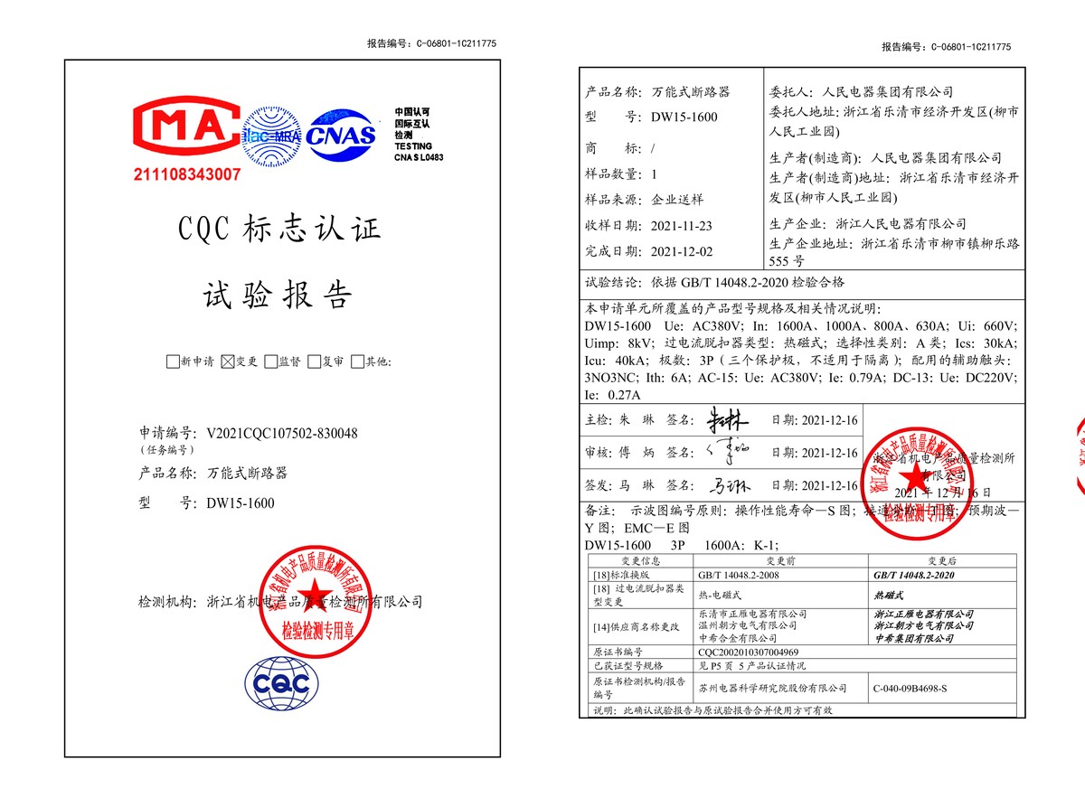CQC试验报告(202112):DW15-1600万能式断路器(点击下载)