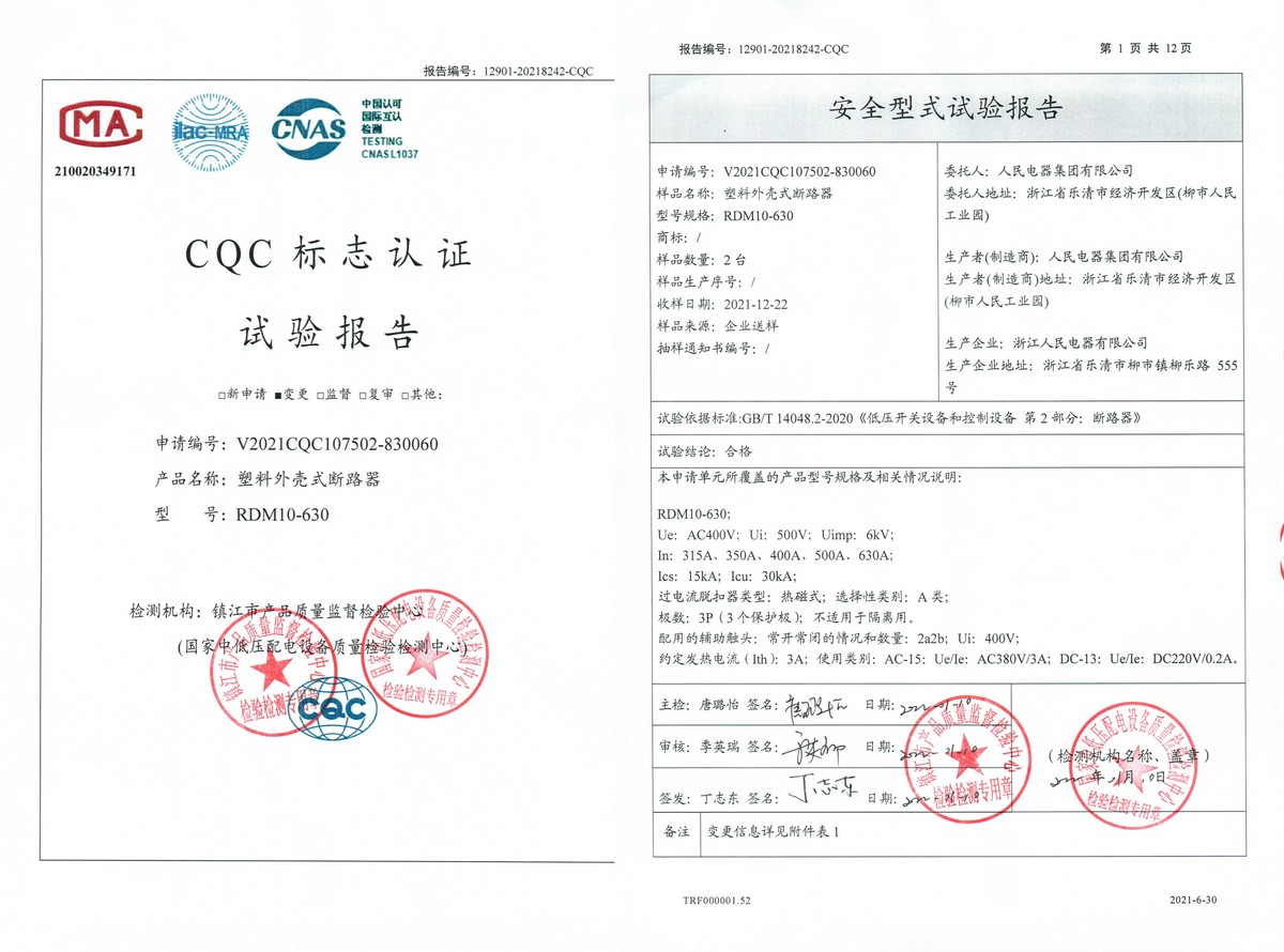 CQC试验报告(202201):RDM10-630塑料外壳式断路器(点击下载)