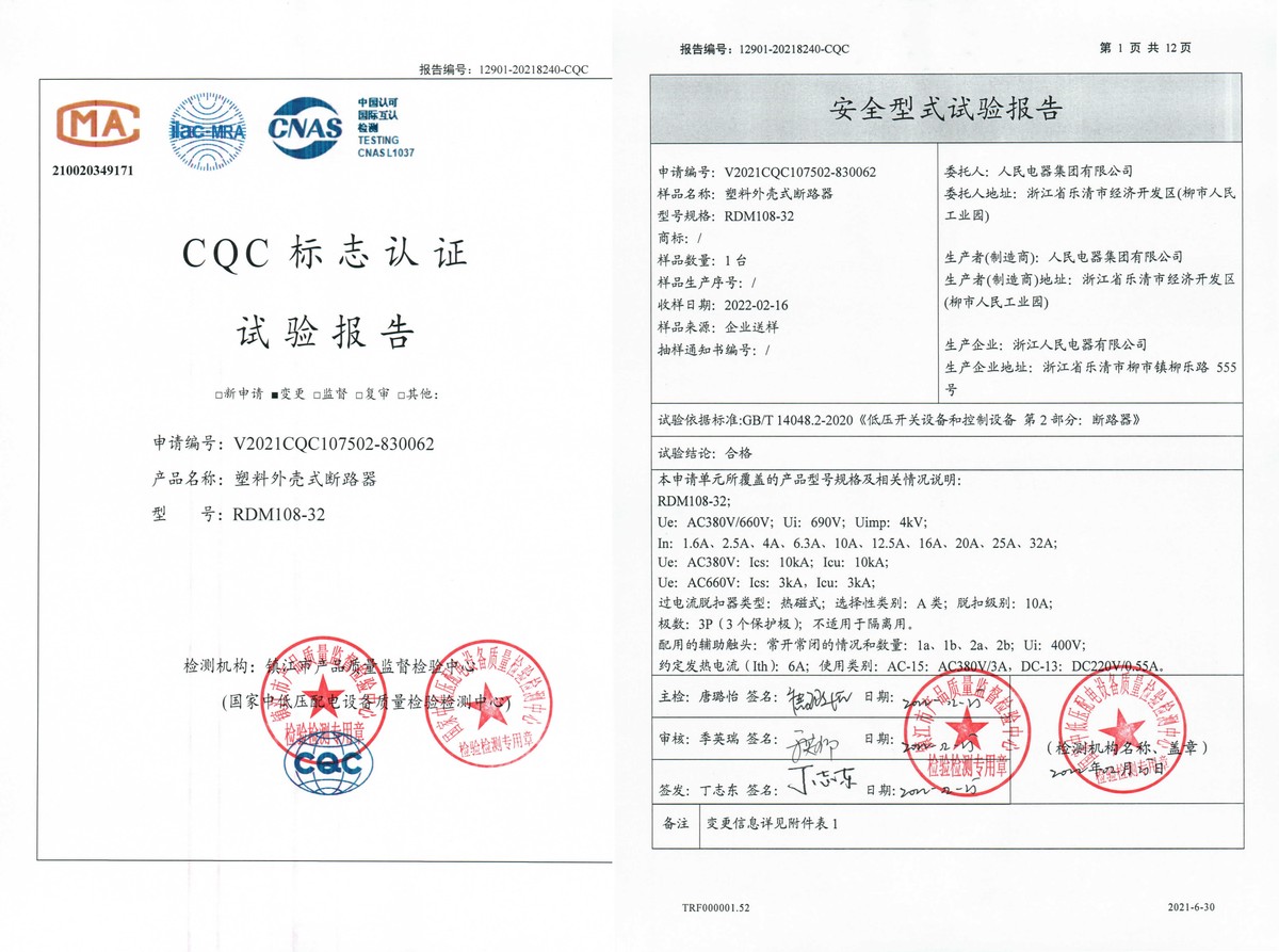 CQC试验报告(202202):RDM108-32塑料外壳式断路器(点击下载)