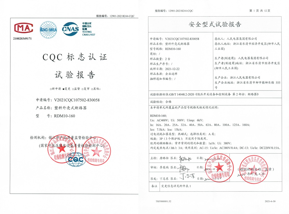 CQC试验报告(202201):RDM10-160塑料外壳式断路器(点击下载)