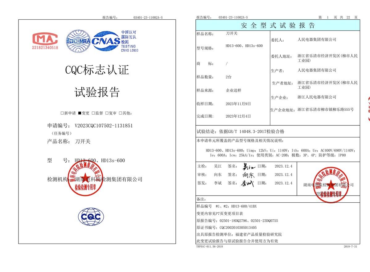CQC试验报告(202312):HD13-600,HD13s-600刀开关(点击下载)