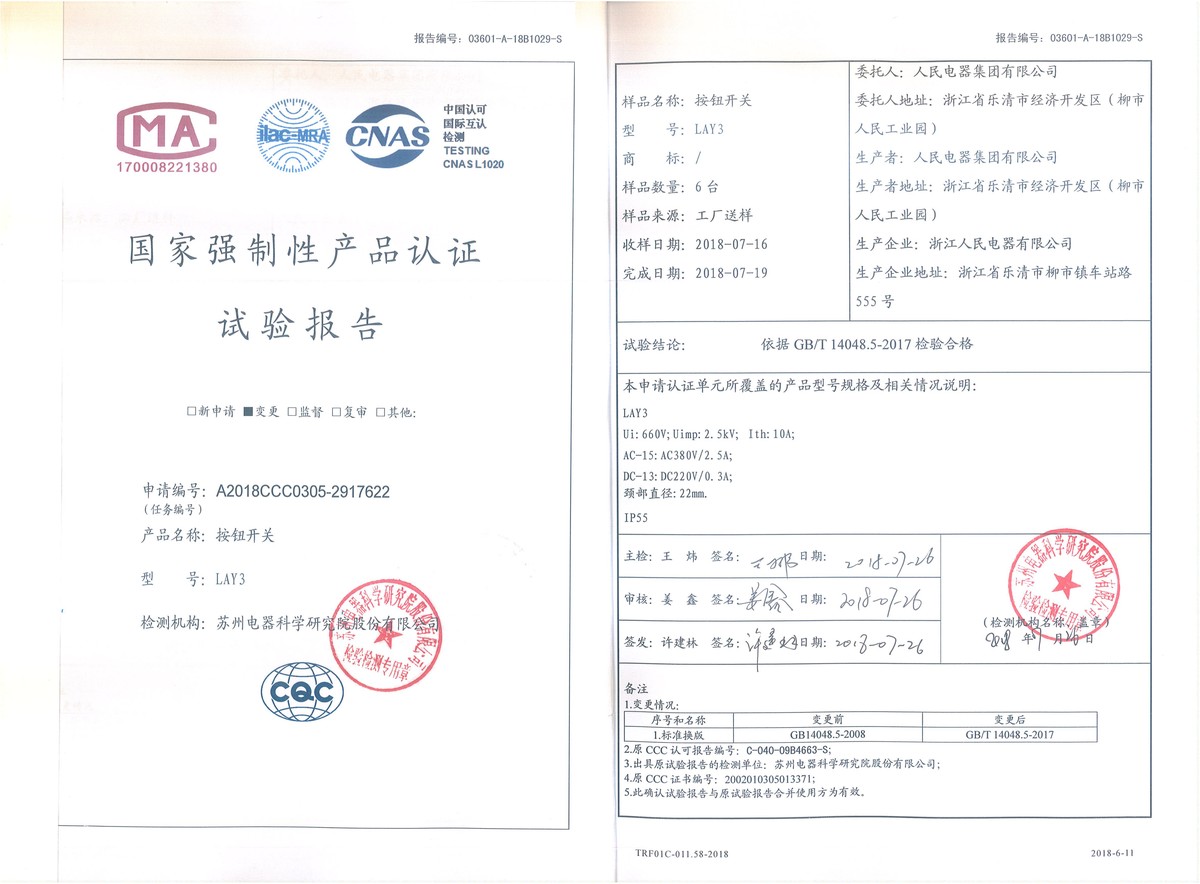 CCC试验报告(201807):LAY3按钮开关(点击下载)