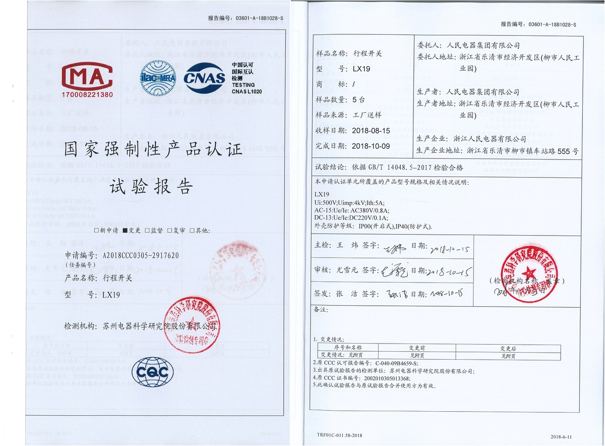 CCC试验报告(201810):LX19行程开关(点击下载)