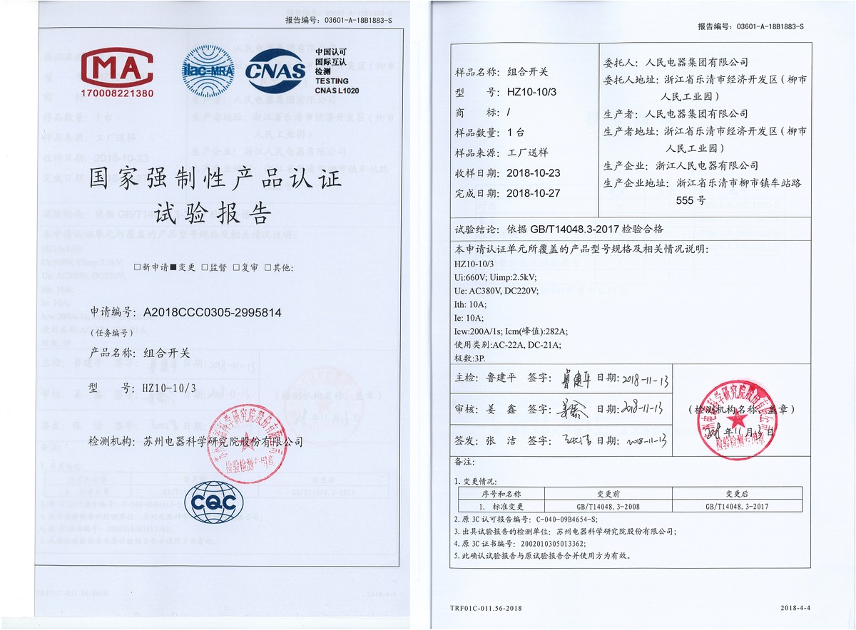 CCC试验报告(201811):HZ10-10/3组合开关(点击下载)