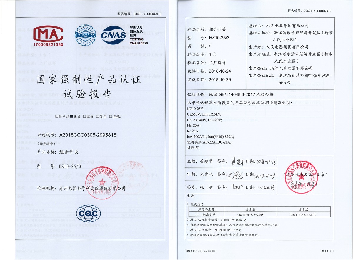 CCC试验报告(201811):HZ10-25/3组合开关(点击下载)