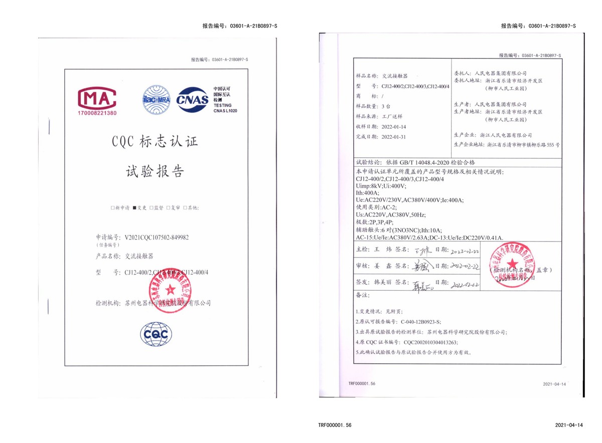 CQC试验报告(202202):CJ12-400/2,CJ12-400/3,CJ12-400/4交流接触器(点击下载)