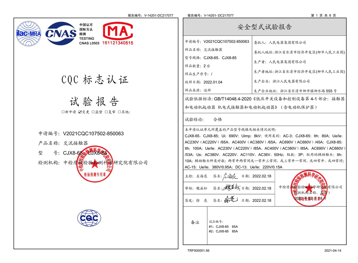 CQC试验报告(202202):CJX8-65,CJX8-85交流接触器(点击下载)