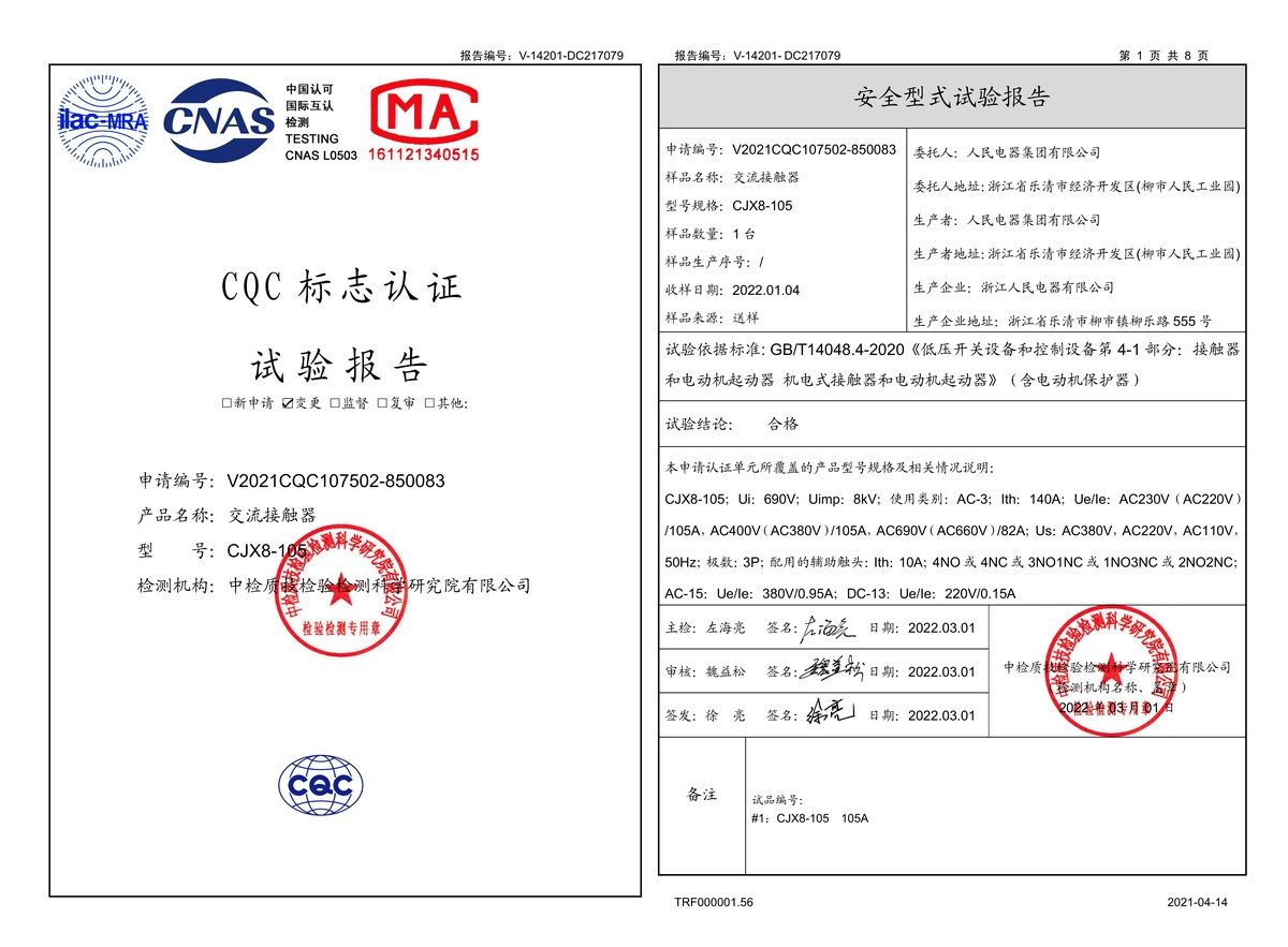 CQC试验报告(202203):CJX8-105交流接触器(点击下载)