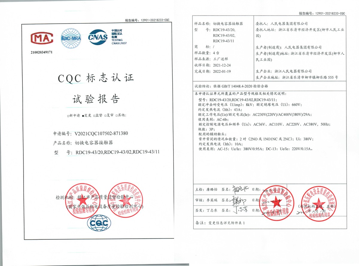CQC试验报告(202201):RDC19-43/20,RDC19-43/02,RDC19-43/11切换电容器接触器(点击下载)