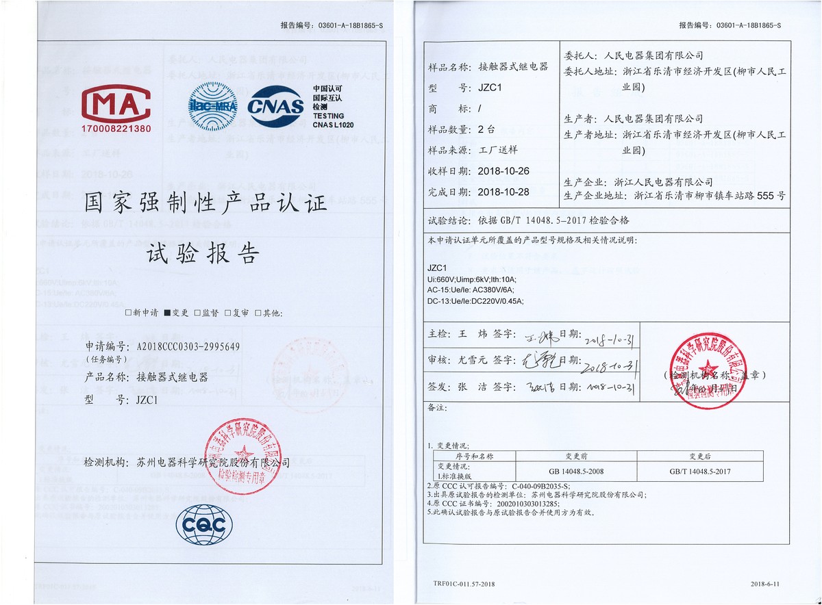 CCC试验报告(201810):JZC1接触器式继电器(点击下载)