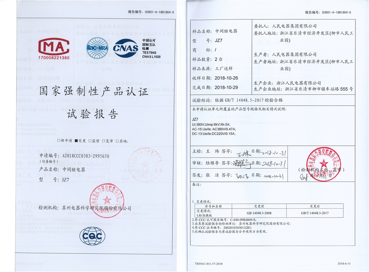 CCC证试验报告(201810):JZ7 中间继电器(点击下载)