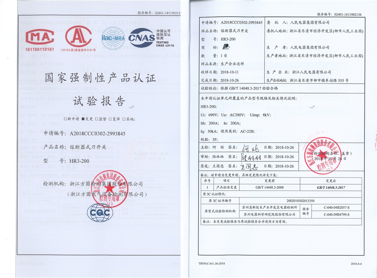 CCC试验报告(201810):HR3-200熔断器式刀开关(点击下载)