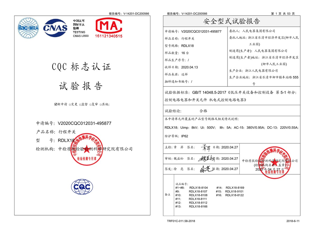 CQC试验报告(202004):RDLX18行程开关(报告编号:V-14201-DC200566)(点击下载)