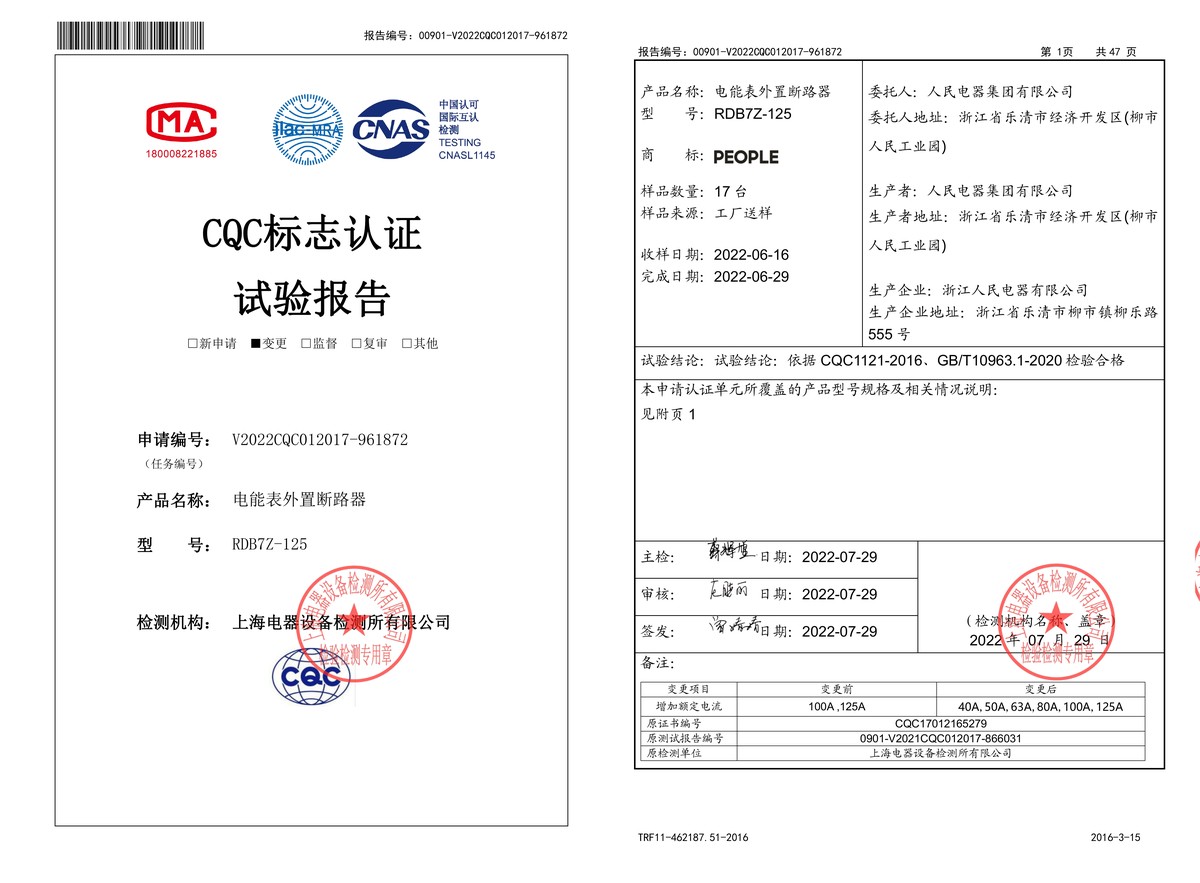 CQC试验报告(202207):RDB7Z-125电能表外置断路器(点击下载)