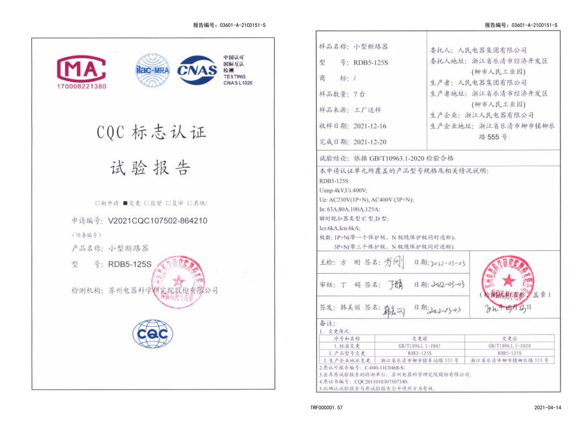 CQC试验报告(202203):RDB5-125S小型断路器(点击下载)