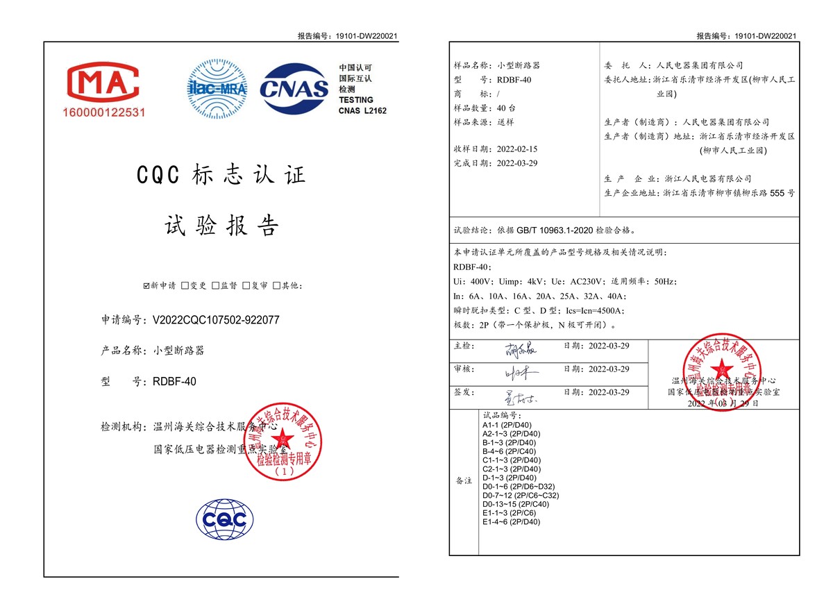 CQC试验报告(202203):RDBF-40小型断路器(点击下载)