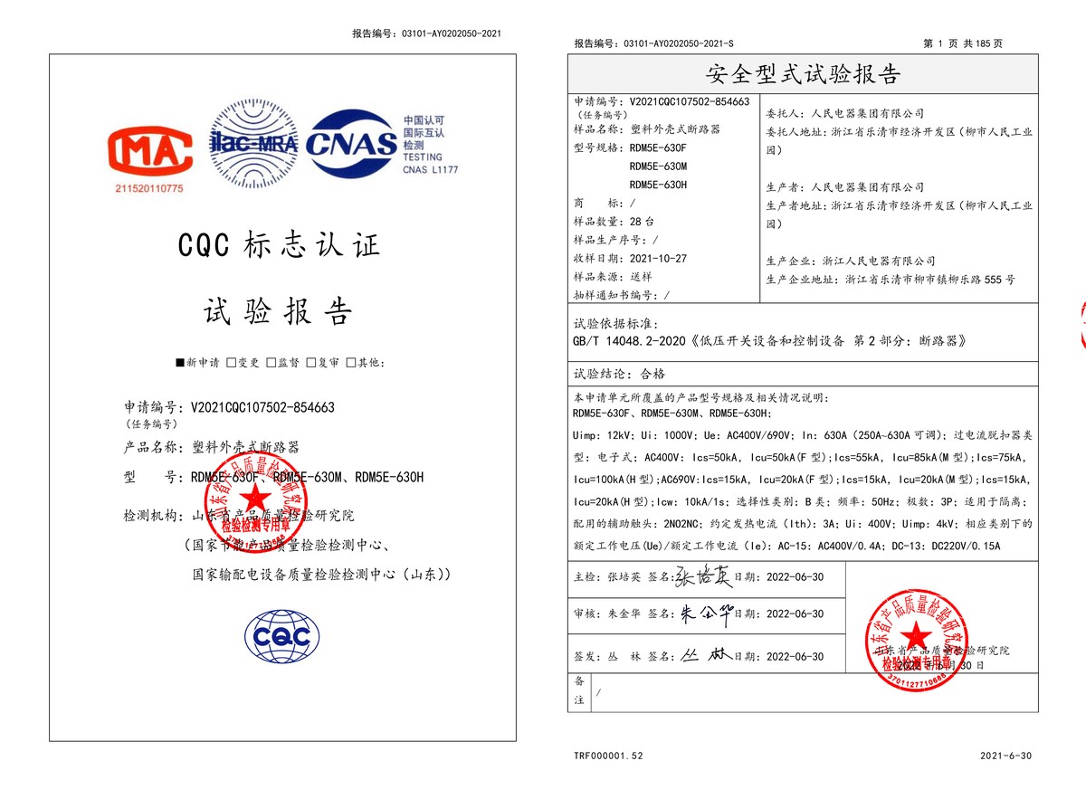 CQC试验报告(202206):RDM5E-630M,RDM5E-630F,RDM5E-630H塑料外壳式断路器(点击下载)