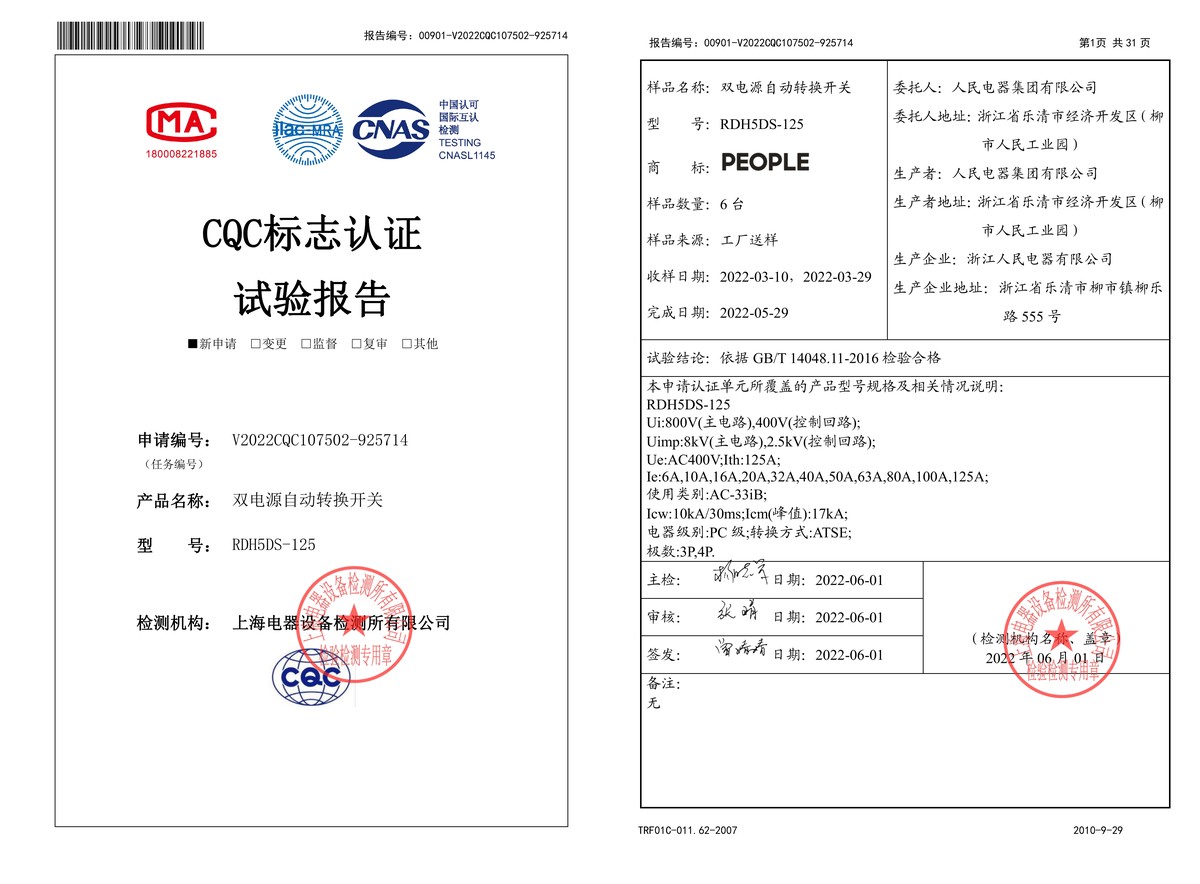 CQC试验报告(202206):RDH5DS-125双电源自动转换开关(点击下载)