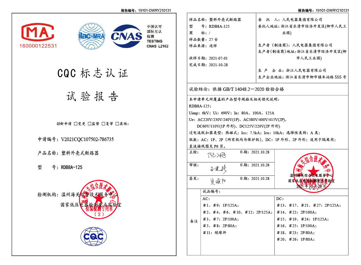 CQC试验报告(202110):RDB8A-125塑料外壳式断路器(点击下载)