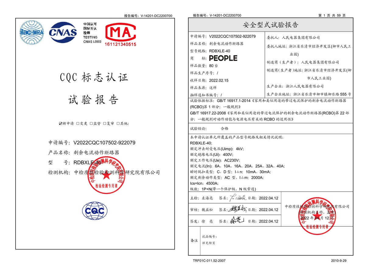 CQC试验报告(202204):RDBXLE-40剩余电流动作断路器(点击下载)