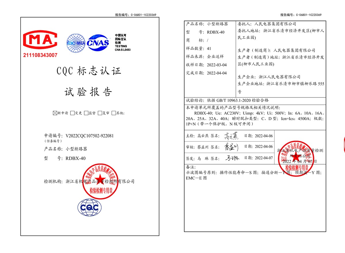 CQC试验报告(202204):RDBX-40小型断路器(点击下载)