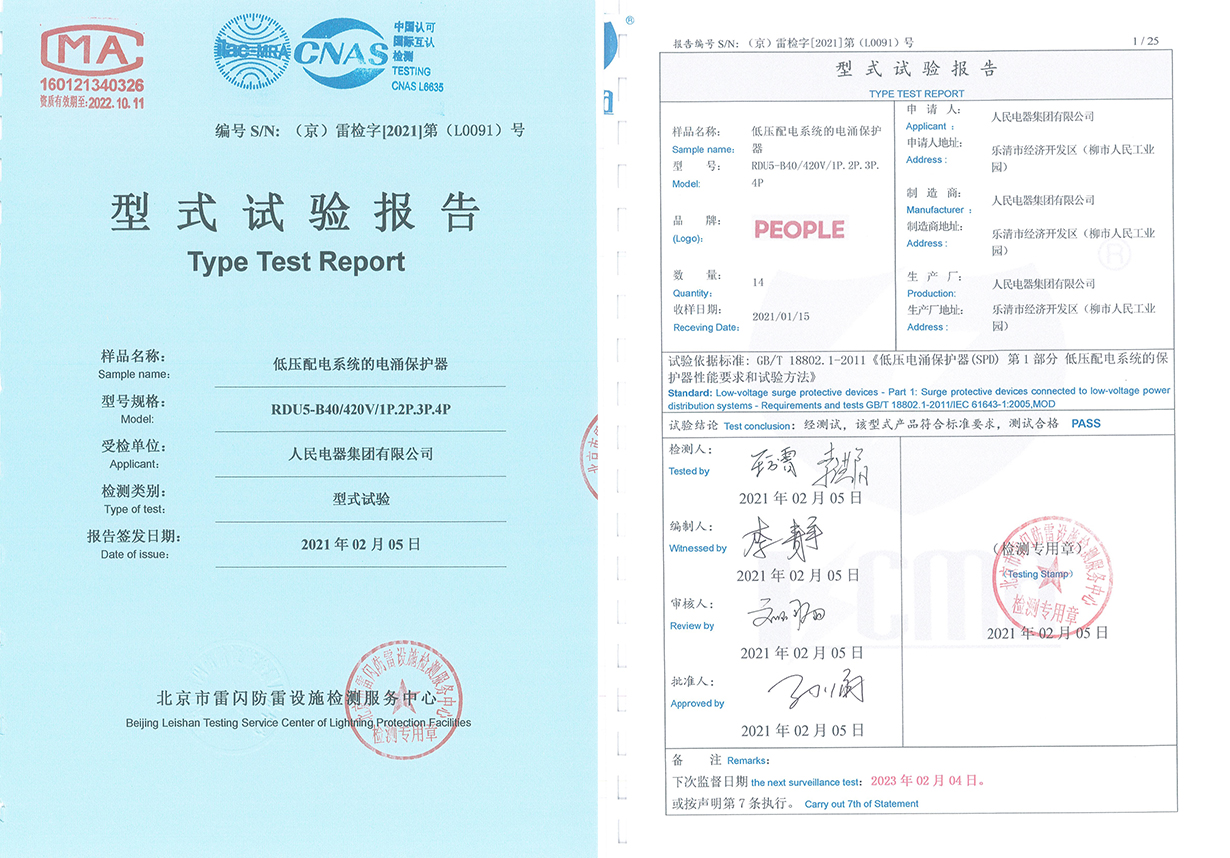 型式试验报告(202102):RDU5-B40电涌保护器(点击下载)