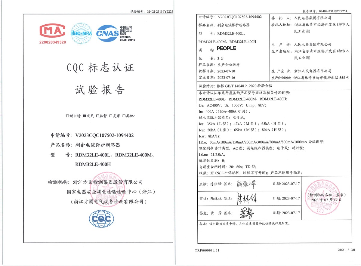 CQC试验报告(202307):RDM32LE-400L,RDM32LE-400M,RDM32LE-400H剩余电流动作断路器(点击下载)