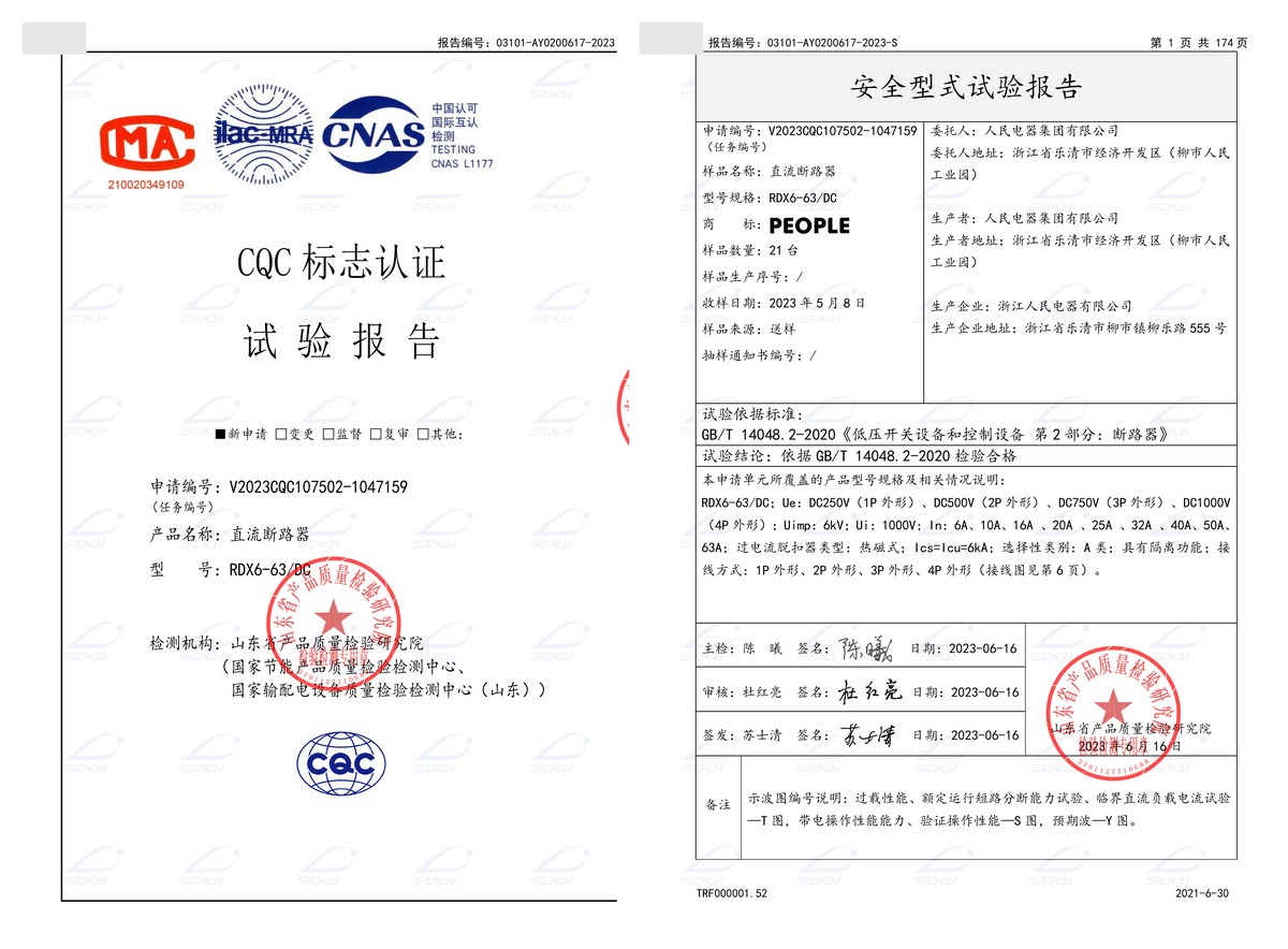 CQC试验报告(202306):RDX6-63DC直流断路器(点击下载)