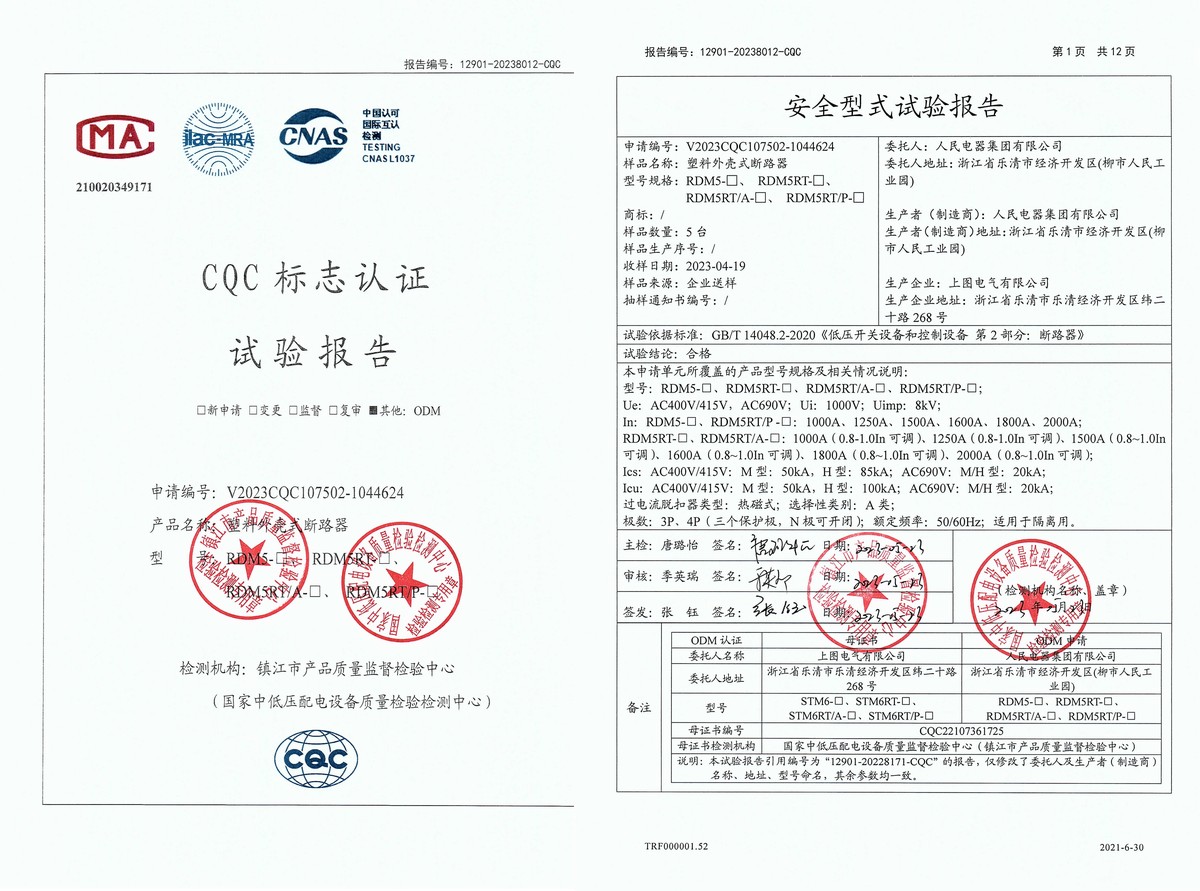 CQC试验报告(202305):RDM5-□,RDM5RT-□,RDM5RT/A-□,RDM5RT/P-□ 1000~2000A塑料外壳式断路器(点击下载)