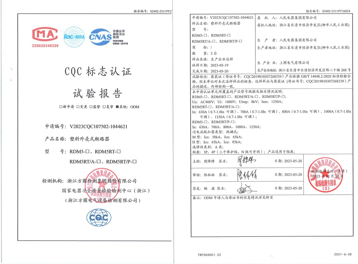 CQC试验报告(202305):RDM5-□,RDM5RT-□,RDM5RT/A-□,RDM5RT/P-□ 630~1250A塑料外壳式断路器(点击下载)