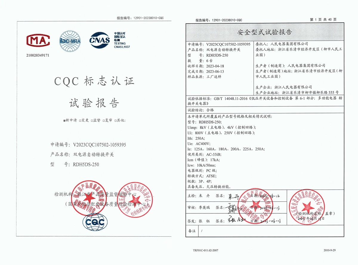 CQC试验报告(202306):RDH5DS-250双电源自动转换开关(点击下载)
