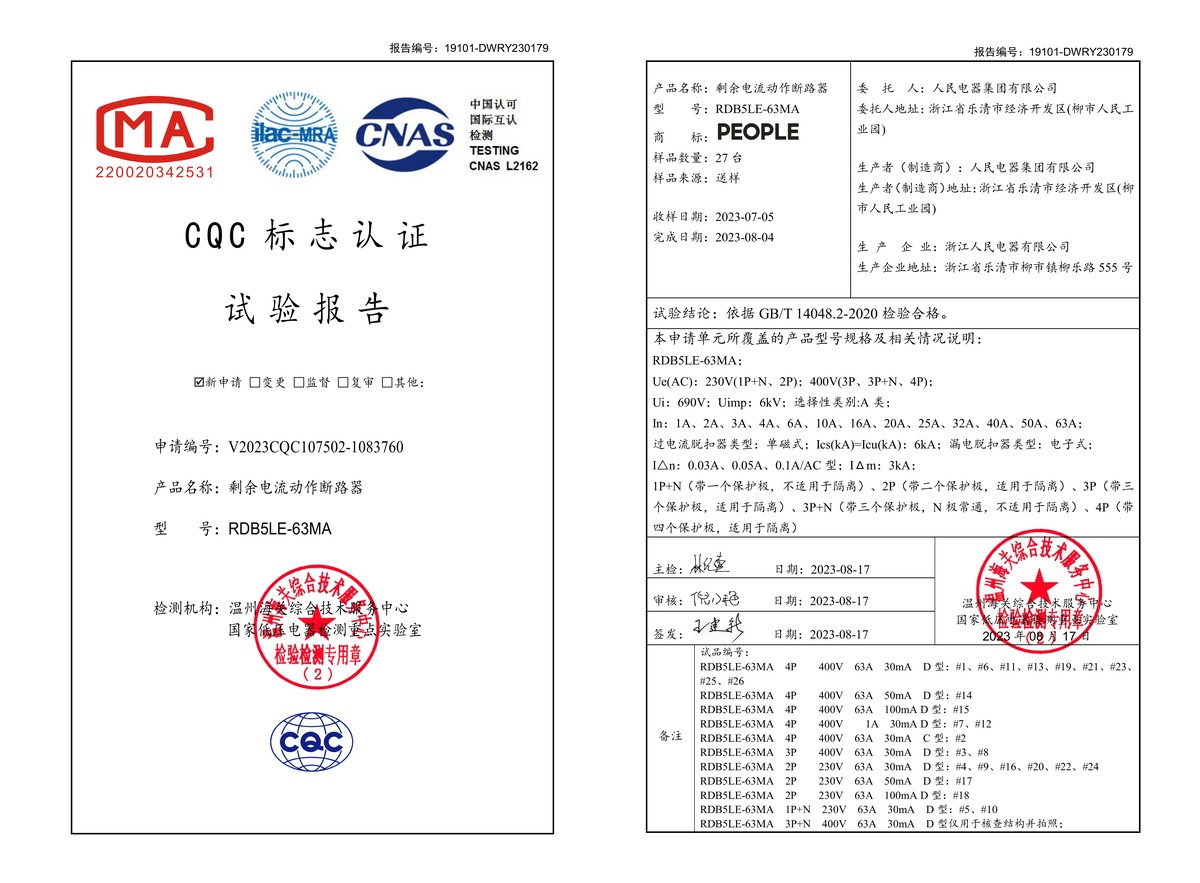 CQC试验报告(202308):RDB5LE-63MA剩余电流动作断路器(点击下载)