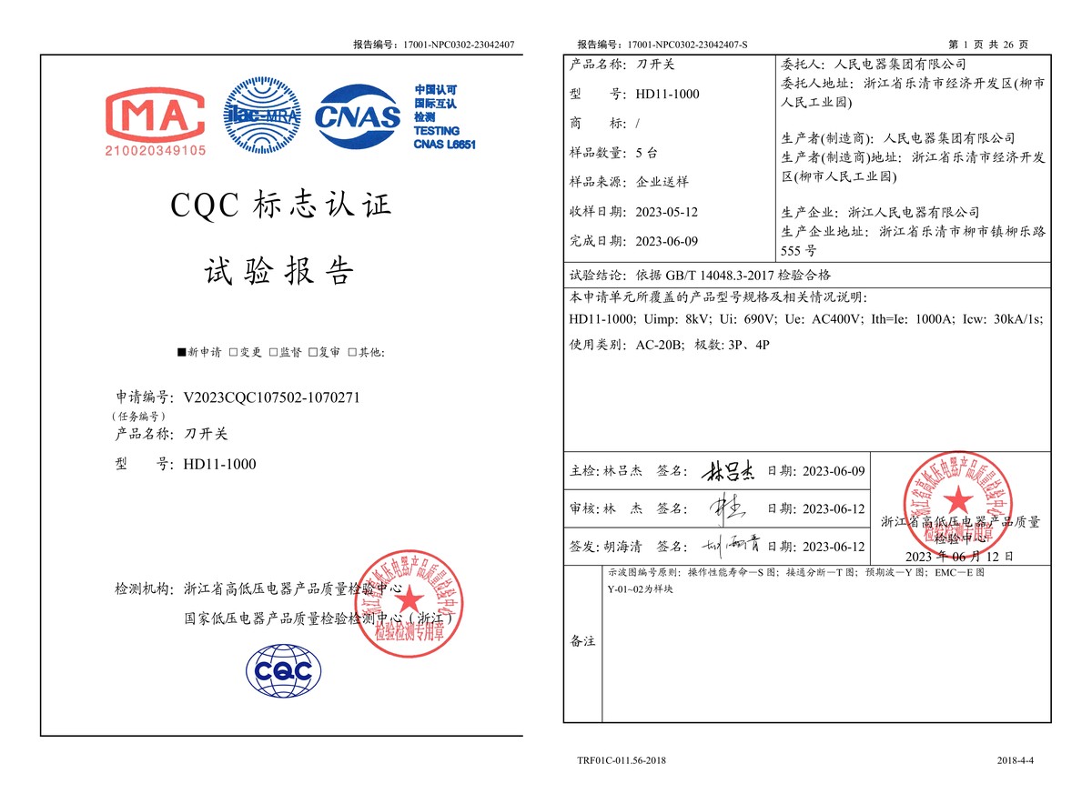 CQC试验报告(202306):HD11-1000刀开关(点击下载)
