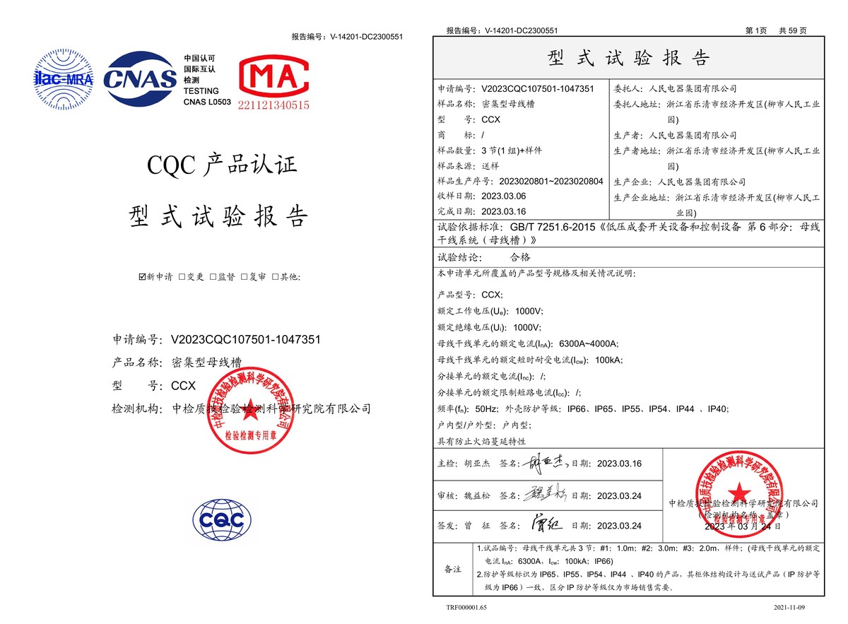 CQC试验报告(202303):CCX 6300A~4000A密集型母线槽(点击下载)