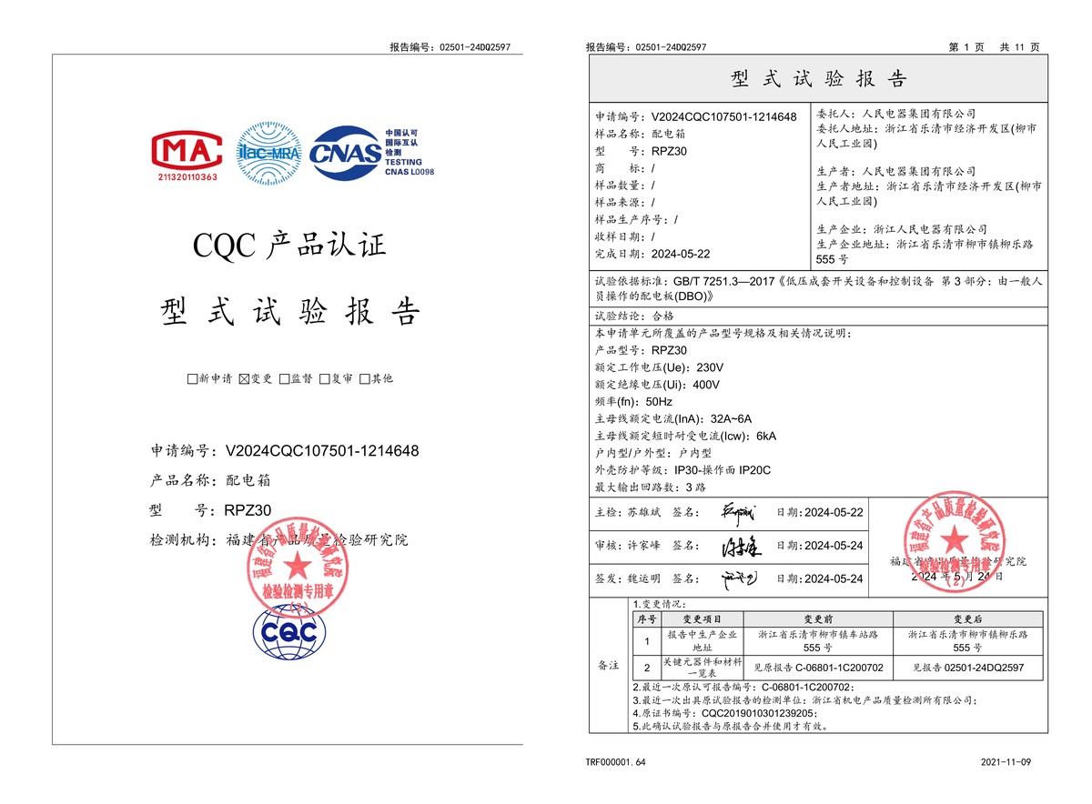 CQC试验报告(202405):RPZ30 32A~6A配电箱(点击下载)