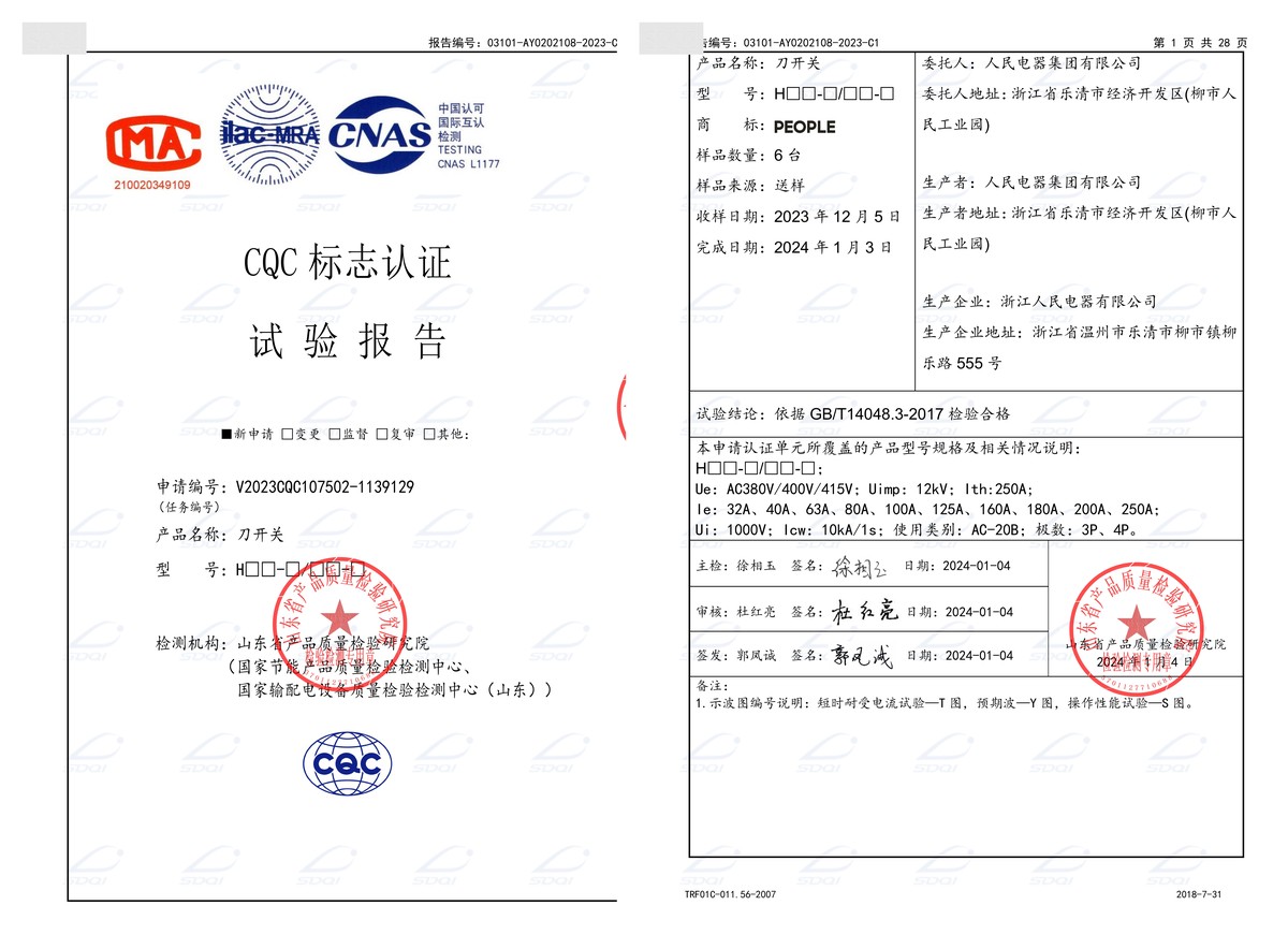CQC试验报告(202401):HD11FH-32~250刀开关(点击下载)