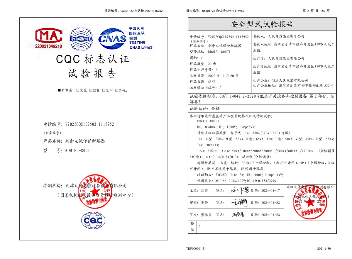 CQC试验报告(202401):RDM1EL-800□剩余电流动作断路器(点击下载)