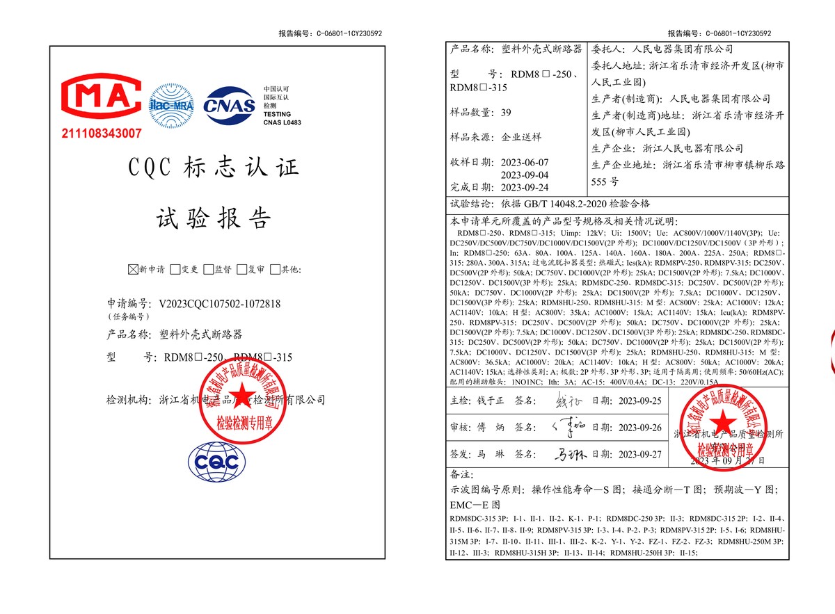 CQC试验报告(202309):RDM8□-250,RDM8□-315塑料外壳式断路器(点击下载)
