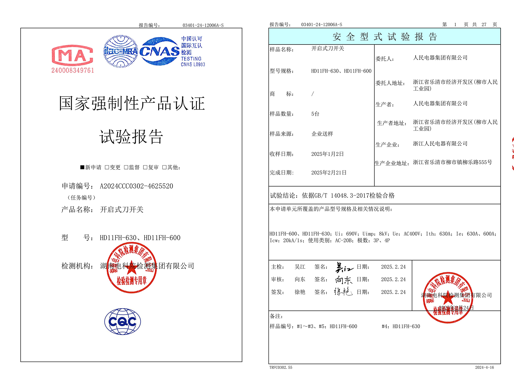 CCC试验报告(202502):HD11FH-600,HD11FH-630开启式刀开关(点击下载)
