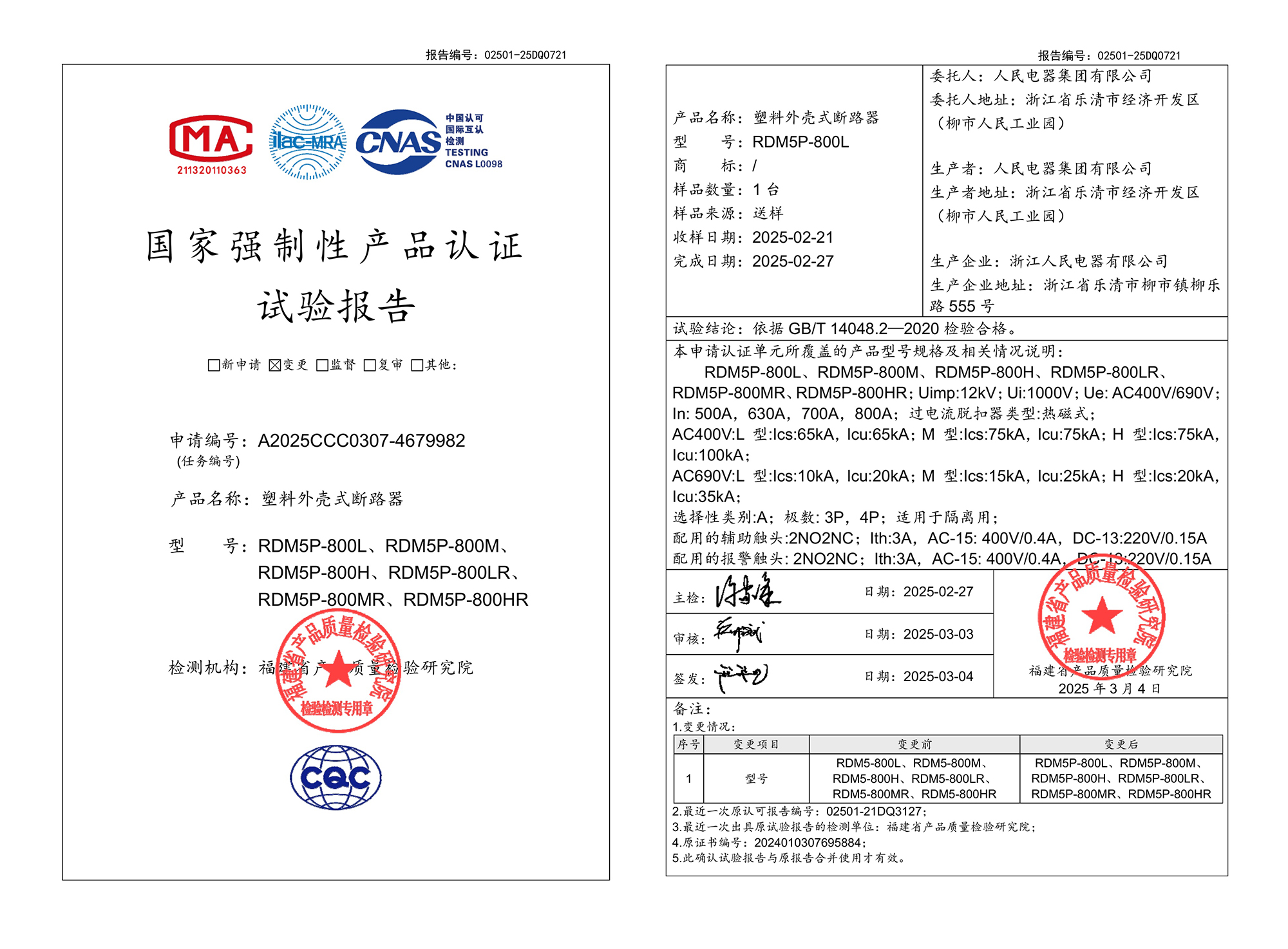 CCC试验报告(202503):RDM5P-800L,RDM5P-800M,RDM5P-800H,RDM5P-800LR,RDM5P-800MR,RDM5P-800HR塑料外壳式断路器(点击下载)