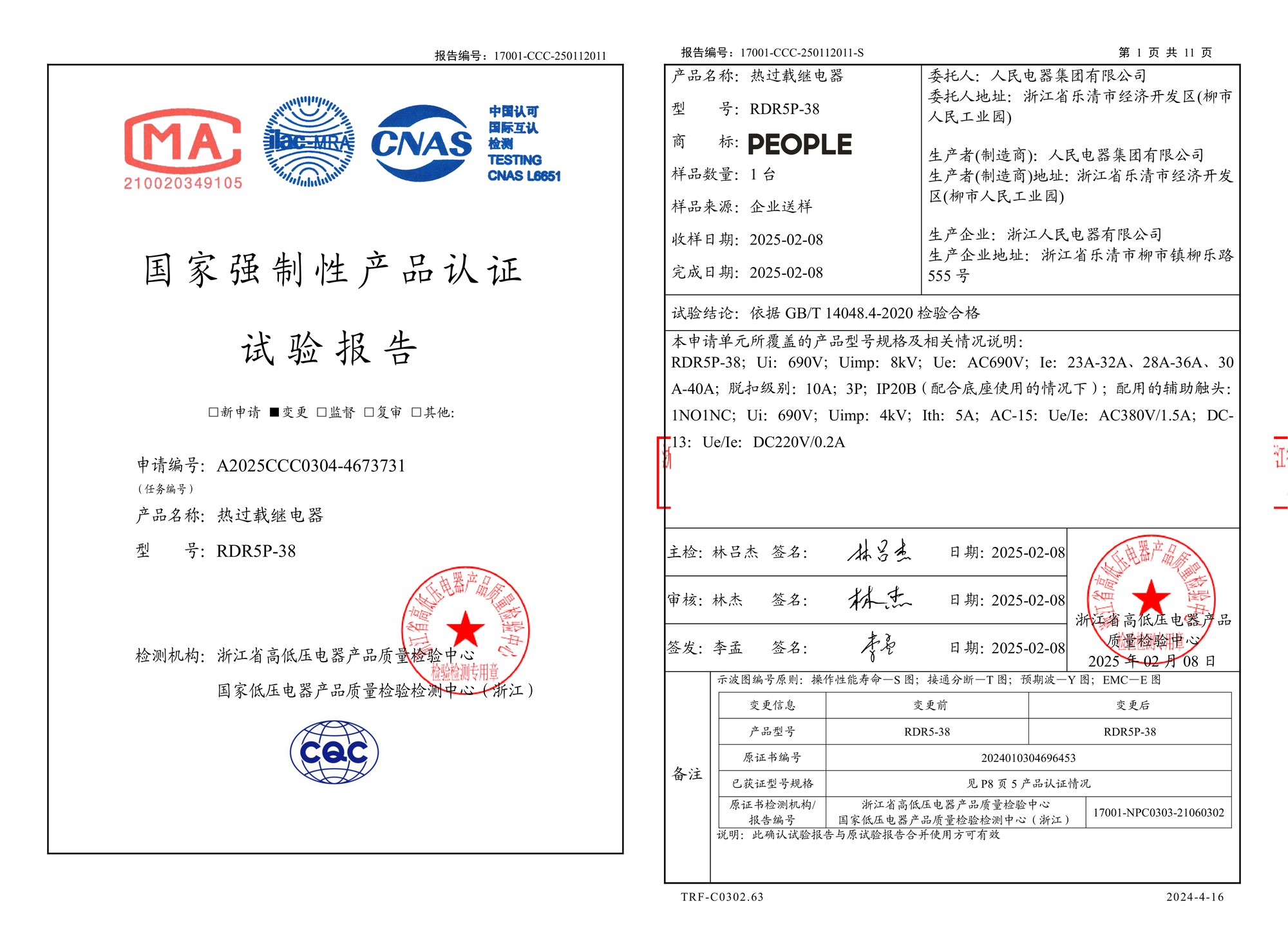 CCC试验报告(202502):RDR5P-38热过载继电器(点击下载)