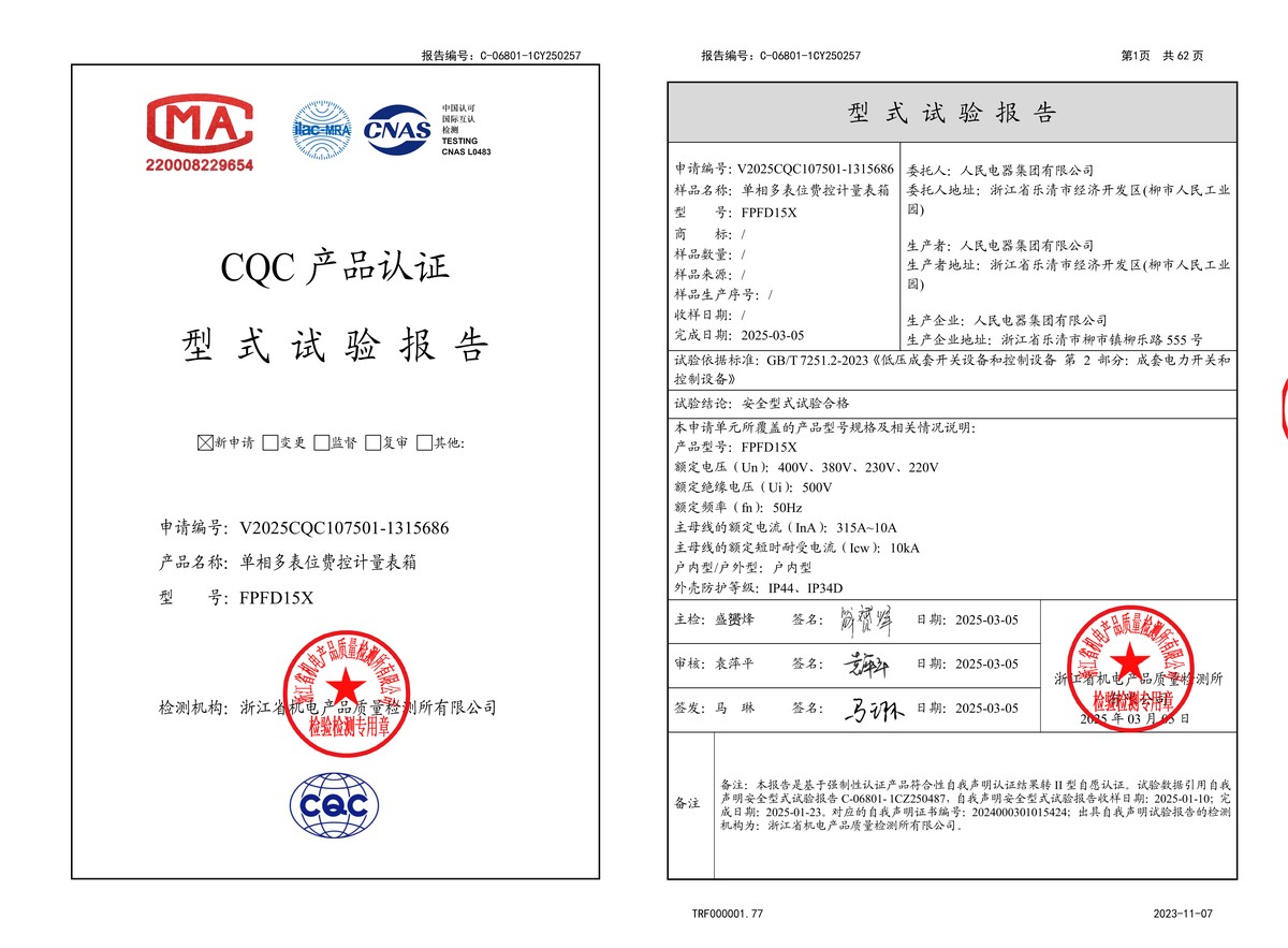 CQC试验报告(202503):FPFD15X单相多表位费控计量表箱(点击下载)