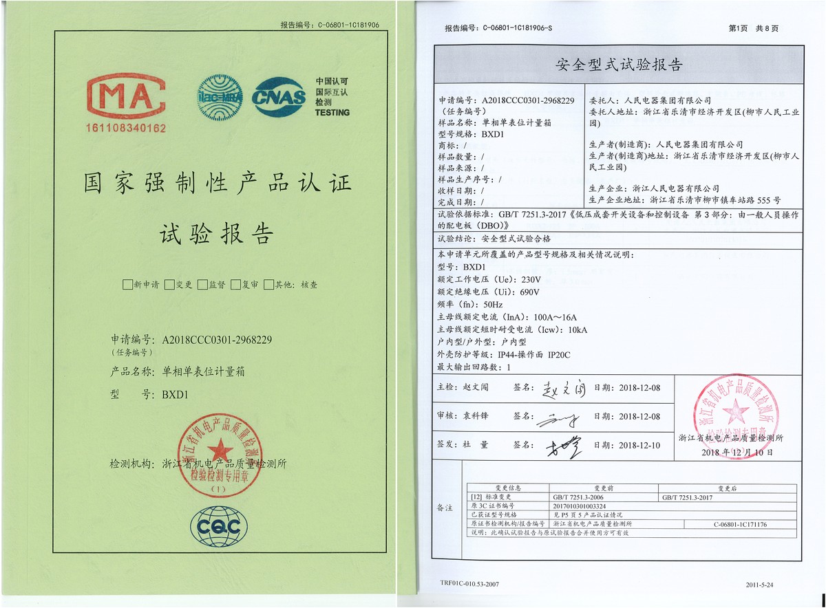 CCC试验报告(201812):BXD1单相单表位计量箱(点击下载)